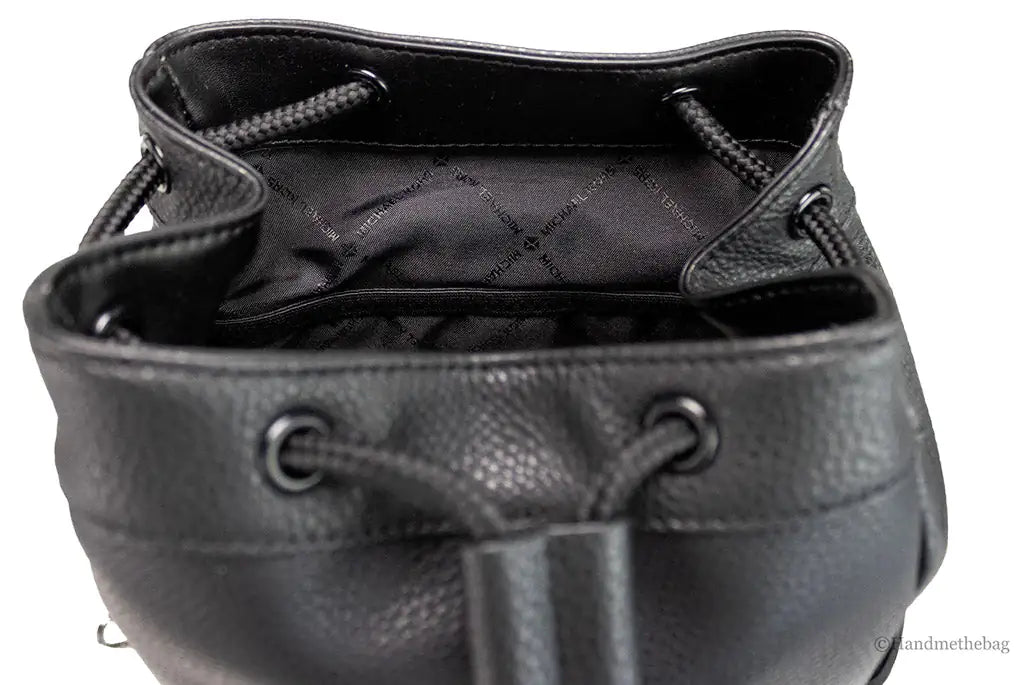Features: Interior Zip and Slip Pockets, Outer Zip Pocket, Fabric Jacquard Lining, Drawstring and Buckle Closure